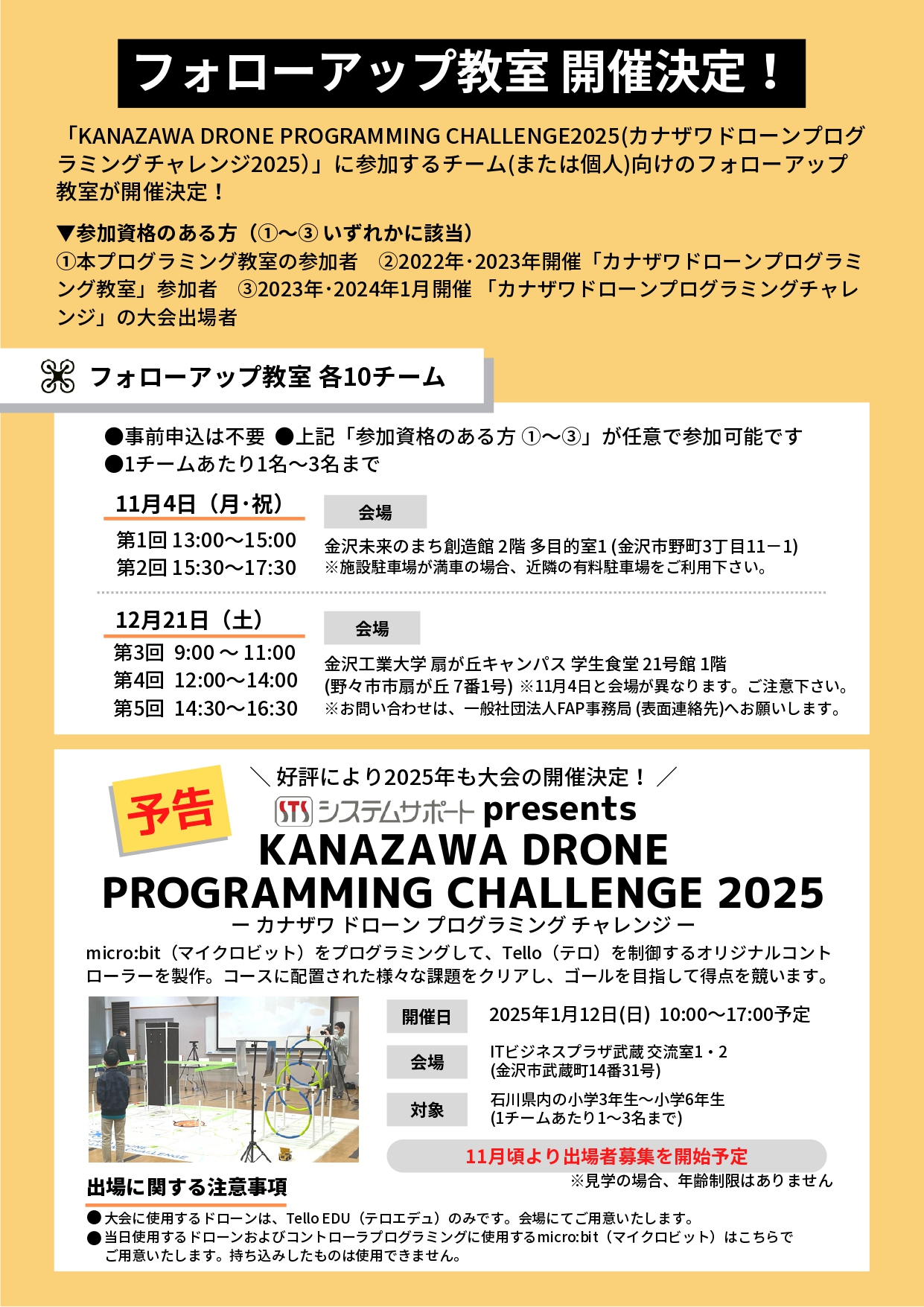 9月8日(日)に引き続き、「カナザワドローンプログラミング教室」!今年度もみなさんのおかげで、開催することになりました。