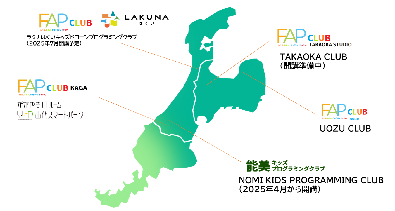 一般社団法人FAPでは、「FAP CLUB」というクラブ活動のような感覚で、地域で気軽に様々なテクノロジーを体験できる「プログラミングクラブ」をその地域に住む方々の手によって、運営をしています。活動拠点は、石川県では、加賀市山代温泉「山代スマートパーク」、能美市「能美キッズプログラミングクラブ」(運営サポート)、富山県の方でも現在、開講にむけて、整備をしています。全国でプログラミングスクール「FAP CLUB」の運営をやってみたい、という方はお気軽にお問い合わせください。